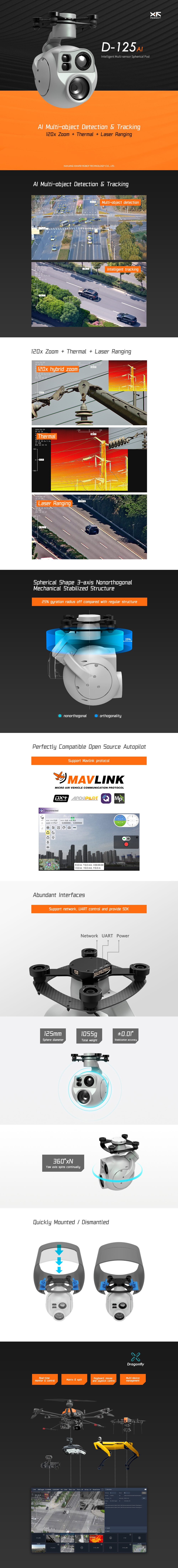 - شكل كروي منخفض وهيكل ميكانيكي غير متعامد ثلاثي المحاور، يقلل من نصف قطر الدوران ومقاومة الرياح للجراب. D-125AI قادر على الدوران باستمرار حول محور الانعراج الخاص به. ويدعم التحكم في الشبكة وUART وS.BUS.