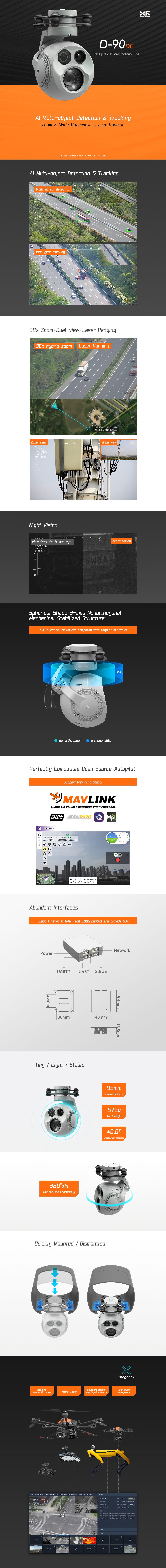 - Die flache Kugelform und die nicht orthogonale, mechanisch stabilisierte 3-Achsen-Struktur minimieren den Rotationsradius und den Windwiderstand des Pods. Der D-90DE ist in der Lage, sich kontinuierlich um seine Gierachse zu drehen.