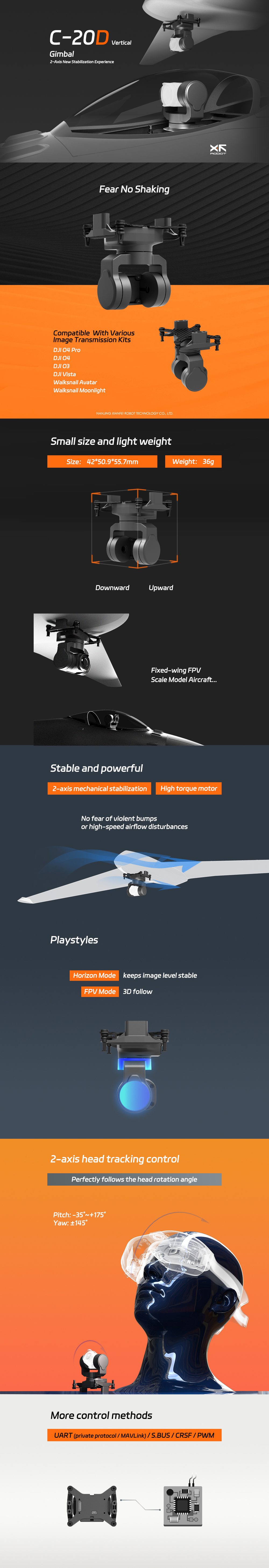 - With a 2-axis mechanical stabilization structure and high-torque motors, the C-20D is able to provides an extreme stabilization effect against the vibration and high-speed air impact.